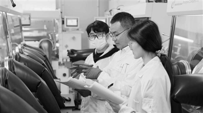 南京大学现代工程与应用科学学院教授谭海仁(中)指导学生开展科研工作。